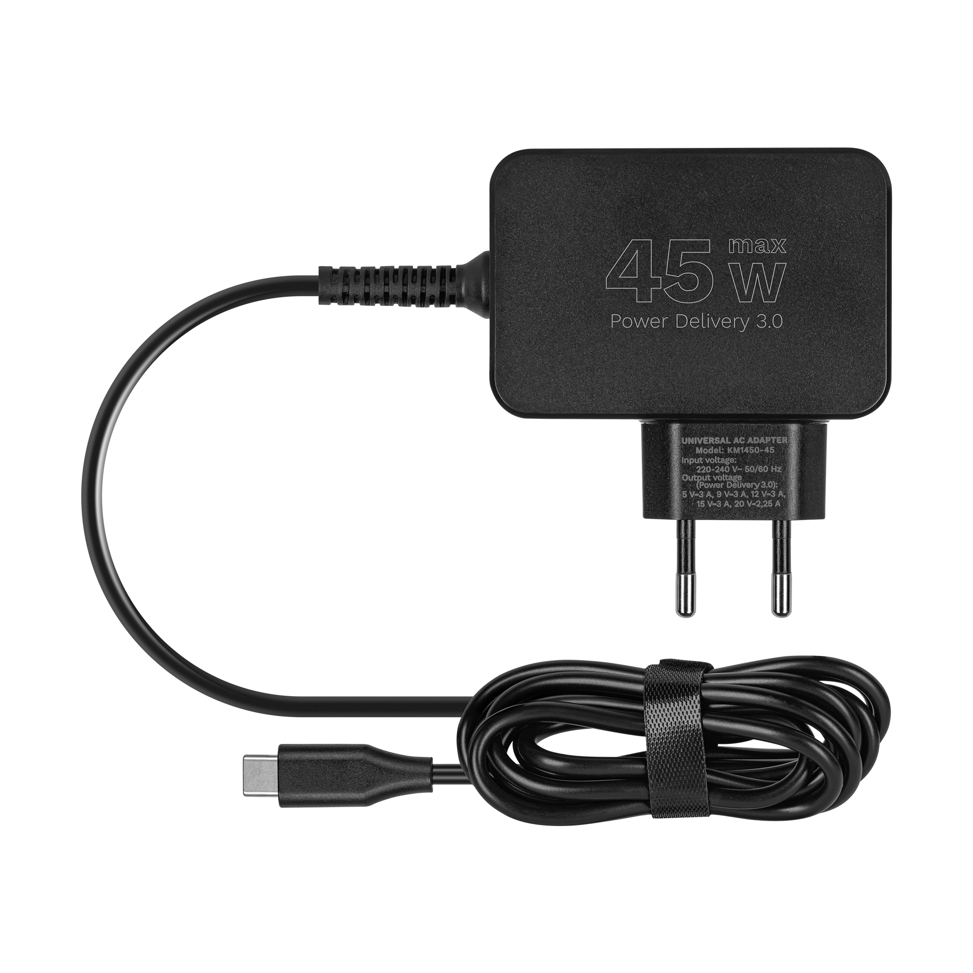 Zasilacz o mocy 45 W zapewnia stabilne i szybkie ładowanie laptopów oraz urządzeń mobilnych. Obsługuje technologię Power Delivery 3.0, oferując różne poziomy napięcia, dzięki czemu automatycznie dostosowuje parametry do podłączonego sprzętu. To praktyczne i energooszczędne rozwiązanie do codziennego użytkowania.