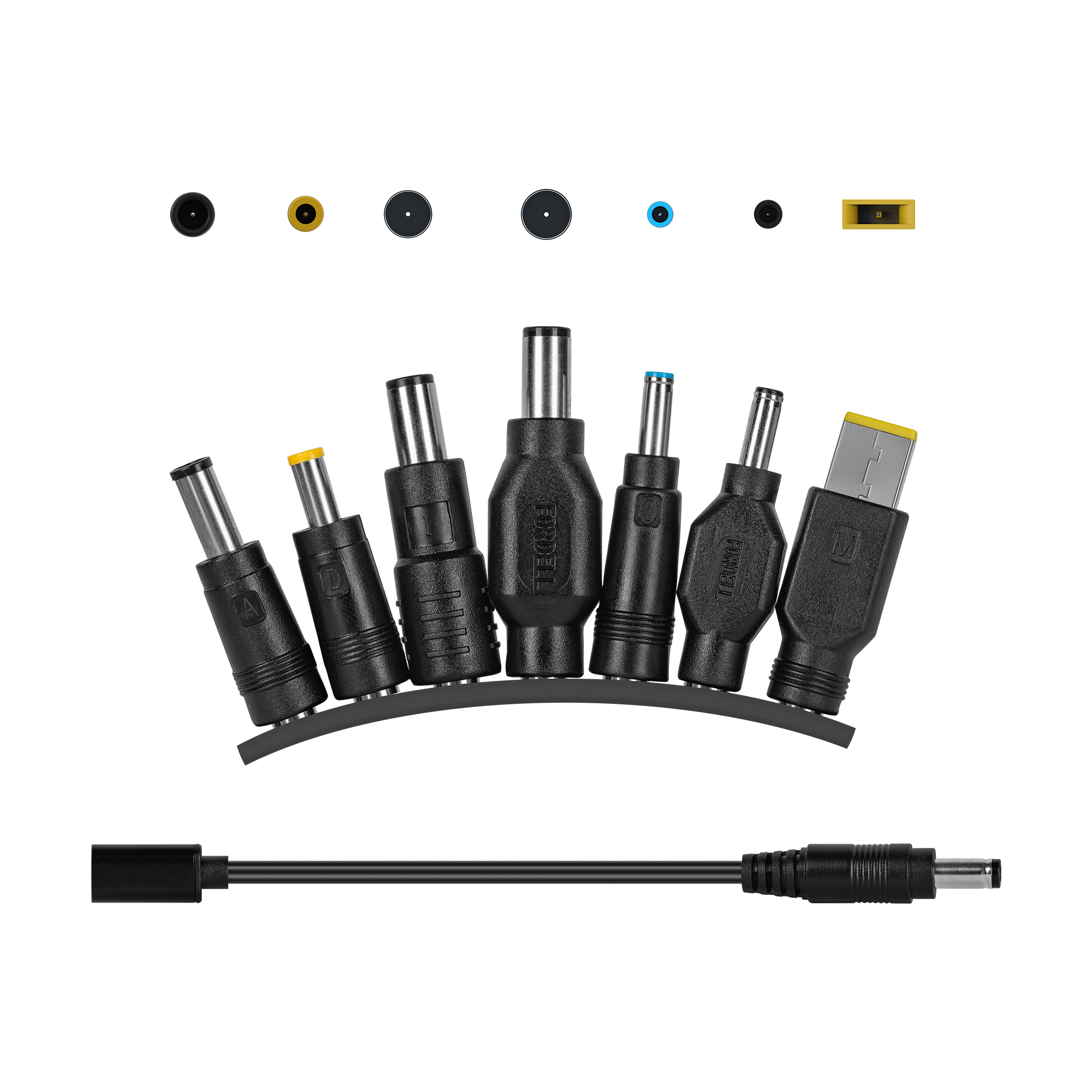 | W zestawie: przejściówka, 7 końcówek: • A: 20 V 6,5 x 4,4 mm - Sony • D: 20 V 5,5 x 3,0 mm - Samsung • I: 20 V 7,4 x 5,0 mm - HP • J: 20 V 7,4 x 5,0 mm - Dell • P: 20 V 4,5 x 3,0 mm - Dell • O: 20 V 4,5 x 3,0 mm - HP • M: 20 V 11 x 4,5 mm - Lenovo |